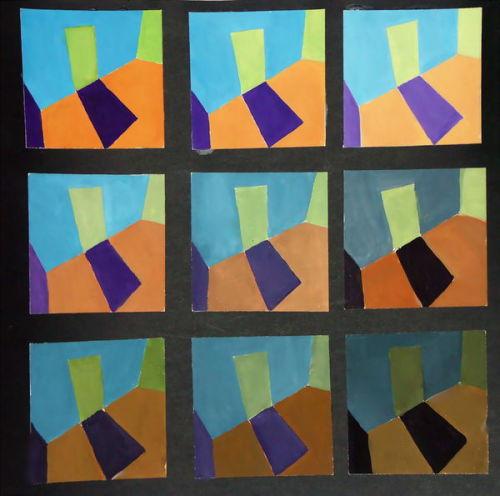 - 接着,将彩色卡纸剪成不同颜色的小条,依次粘贴在黑色卡纸的上方,形成九种不同明度的颜色。